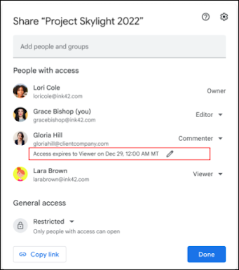 例えば、ファイルの「編集者」権限が期限切れになると、フォルダで持っている「閲覧者」権限に自動的に戻るようになり、完全にアクセスを失うことはありません。