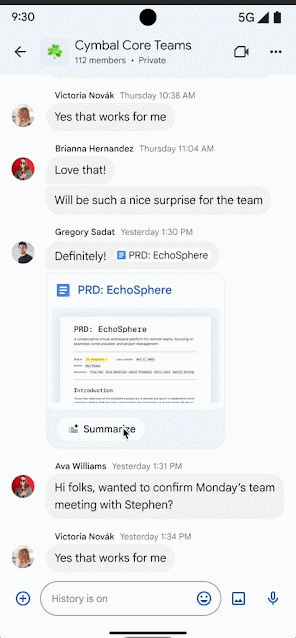 この機能は、既にデスクトップ版で提供されていたものですが、今回モバイル版にも拡大されました。会話内のファイルプレビューカードに表示される「Summarize」(要約)ボタンをタップするだけで、Geminiがファイルを要約し、Chatを離れずにすばやく内容を把握することができます。